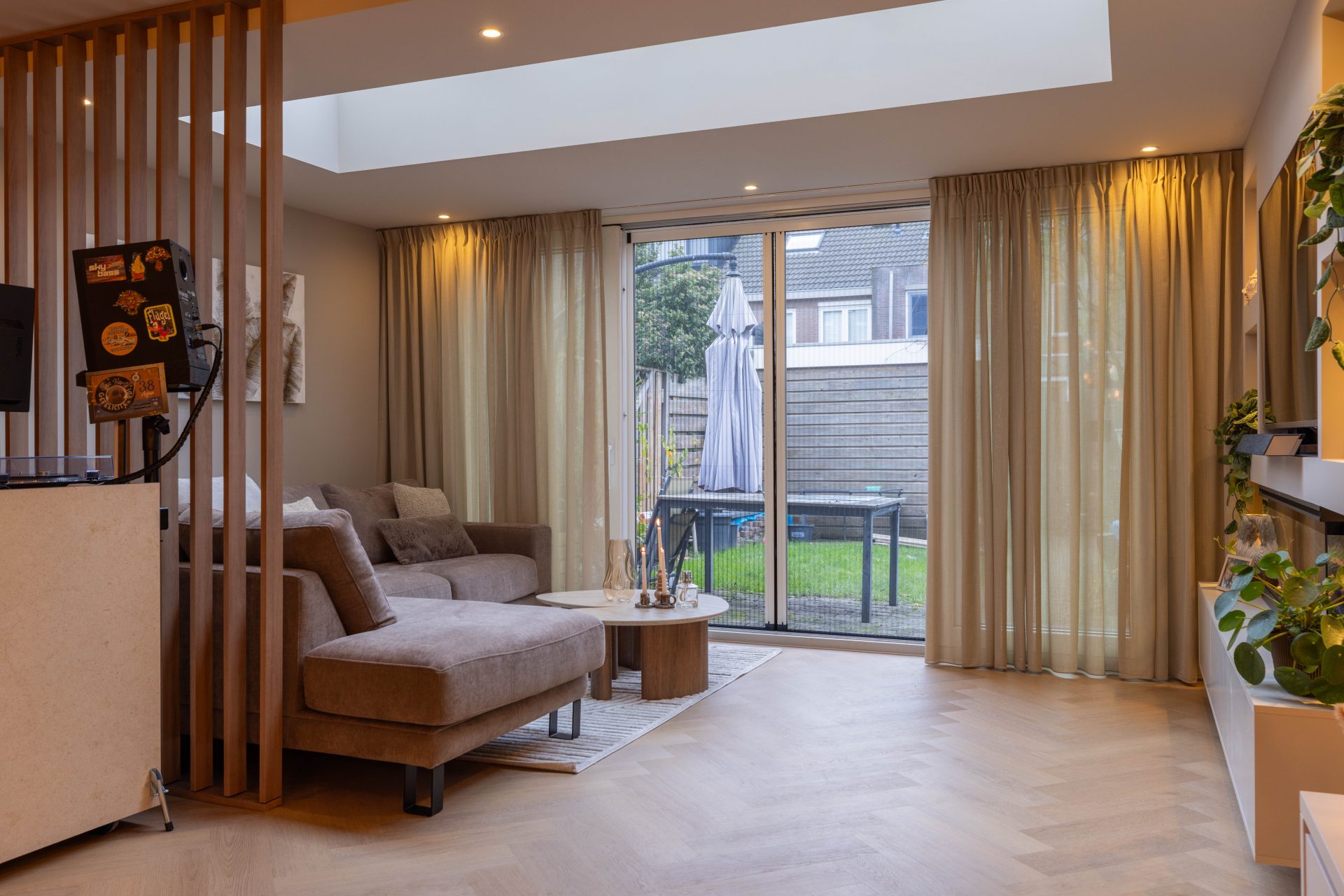 Laura kiest voor natuurlijke materialen en warme tinten om een rustige, samenhangende sfeer in de woonkamer te creëren. Donkere houtaccenten geven het interieur een luxe uitstraling, terwijl de ruimte tegelijkertijd praktisch is ingericht. Slimme opbergruimtes en aanpassingen zoals automatische deuren en bedienbare gordijnen zorgen ervoor dat het huis niet alleen mooi, maar ook praktisch is afgestemd op Deans behoeften.