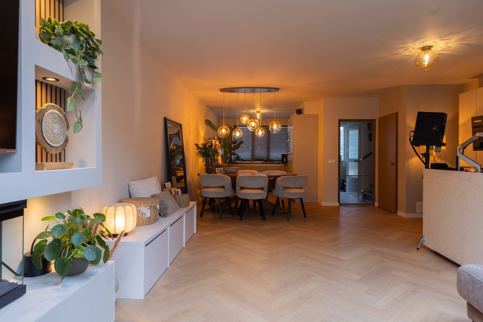 Vooral de vloer was het stel een doorn in het oog en hoe zorg je ervoor dat de keuken en eetruimte op elkaar af te stemmen. Het team bracht een oplossing door een houten afscheiding te plaatsen tussen de keuken en de eettafel en stoelen. Dit verbindende element, samen met de ronde vormen van de tafel en stoelen, creëert een gezellige en speelse sfeer. Daarnaast werd er een nieuwe vloer aangelegd die doorloopt van de gang naar de woonkamer en keuken, wat zorgt voor een ruimtelijk en verbonden gevoel. Het resultaat is een interieur dat modern en knus aanvoelt, helemaal afgestemd op hun wensen.
